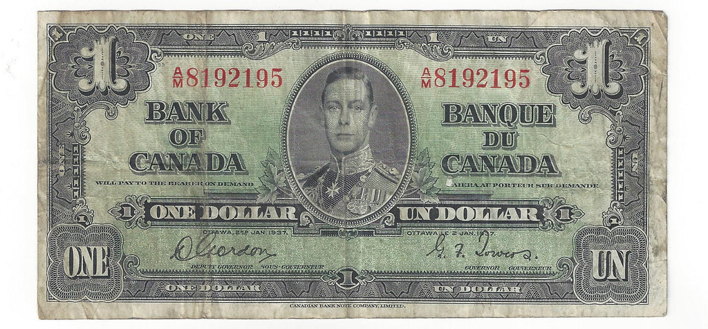 1937 Canada $1 Banknote Gordon-Towers (WP), A/M, BC-21c (VG)