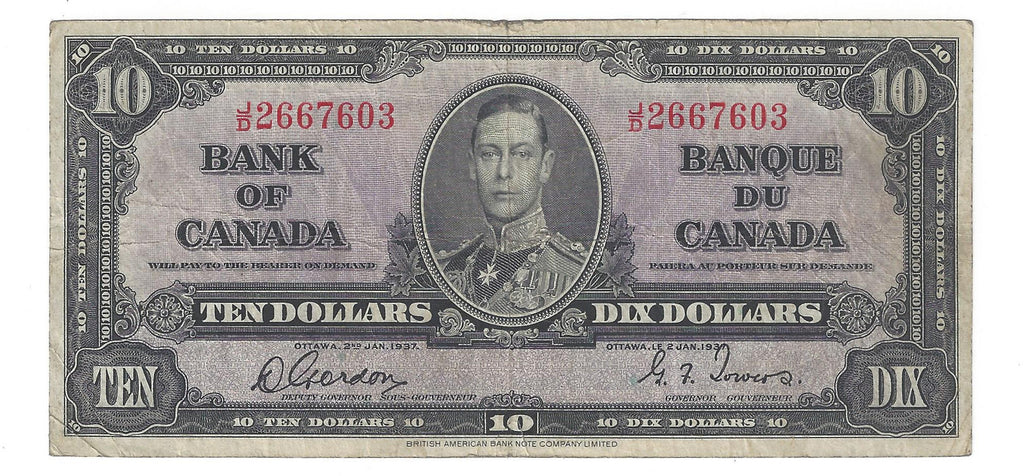 1937 $10 Bank of Canada Note Gordon-Towers,J/D, BC-24b (VF)