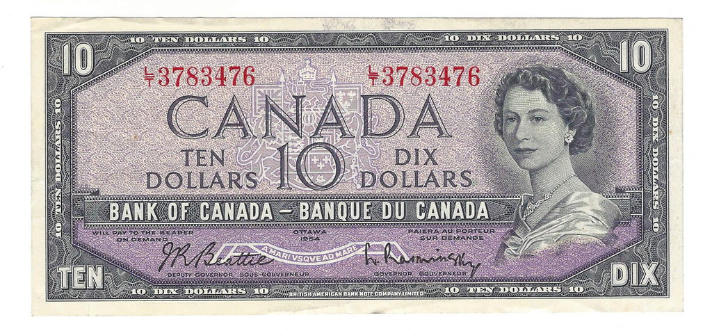 1954 Canada $10 Banknote Beattie-Rasminsky, L/T, BC-40b (EF)