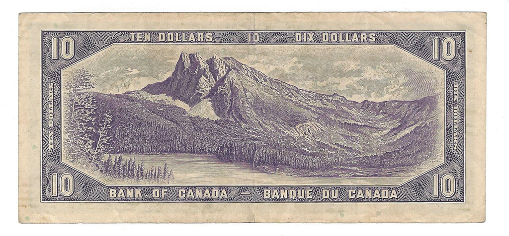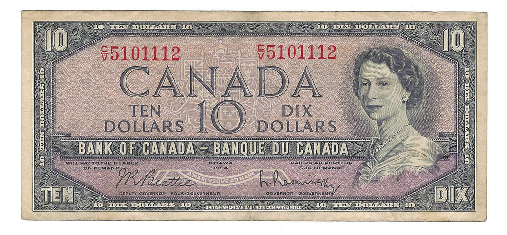 1954 Canada $10 Banknote Beattie-Rasminsky, C/V, BC-40b (Fine)