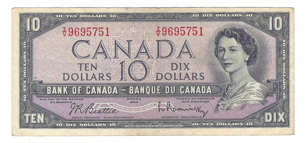 1954 Canada $10 Banknote Beattie-Rasminsky, I/V, BC-40b (VF)