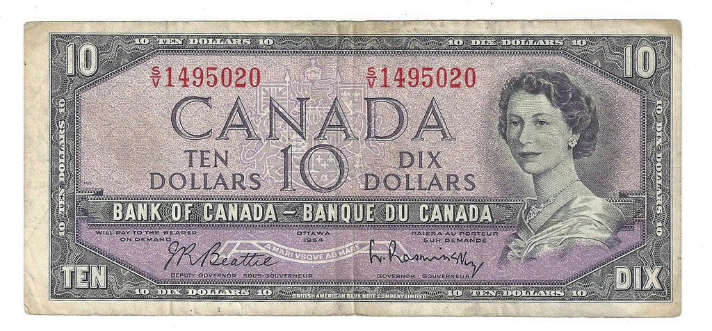 1954 Canada $10 Banknote Beattie-Rasminsky, S/V, BC-40b (Fine)