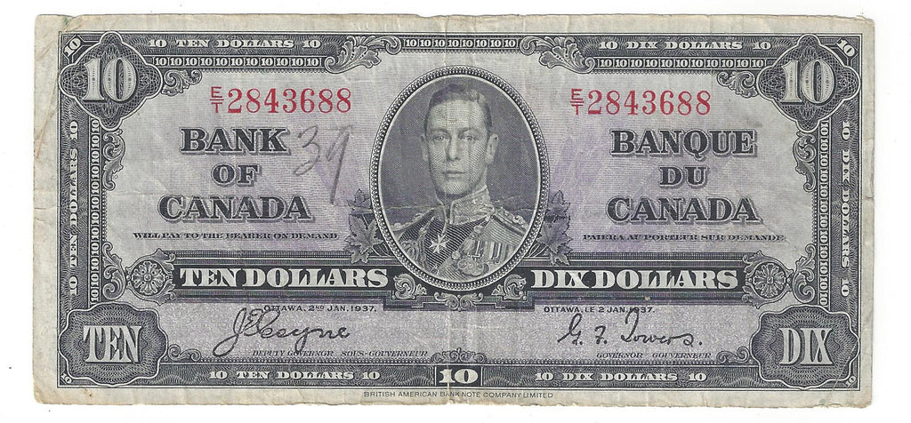1937 $10 Bank of Canada Note Coyne-Towers Prefix E/T2843688 BC-24c (VG)