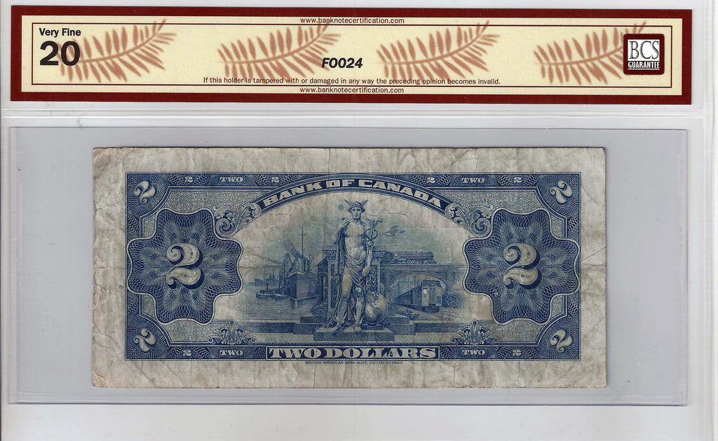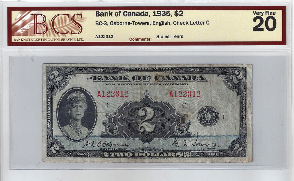 1935 Canada $2 Banknote Osborne-Towers, English, BC-3 BCS Certified (VF-20 )