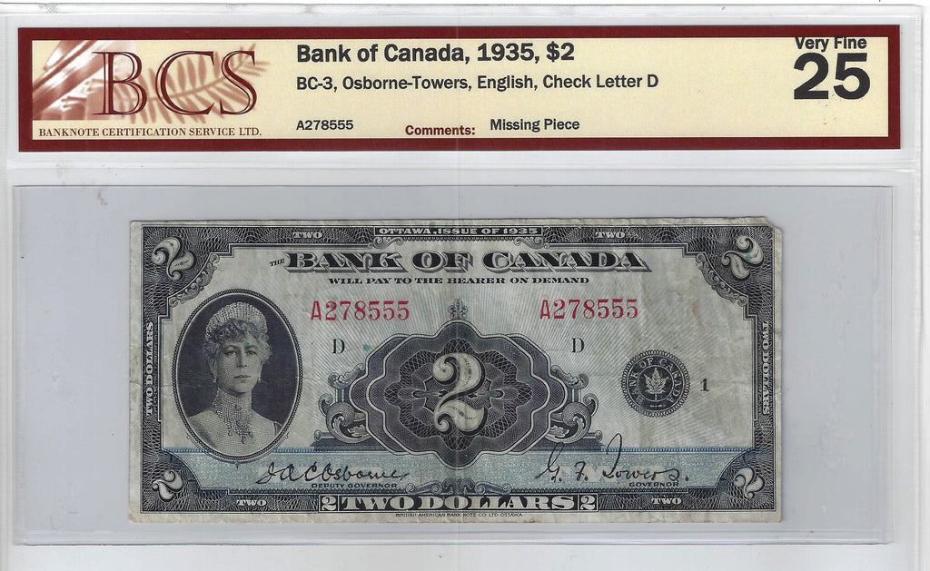 1935 Canada $2 Banknote Osborne-Towers, English Text, BC-3 BCS Certified (F-25)