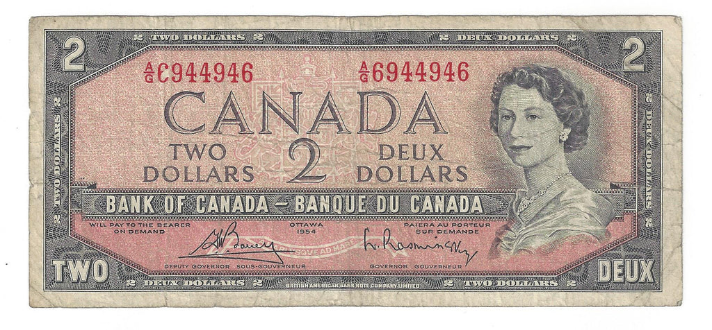 1954 Canada $2 Banknote Bouey-Rasminsky, A/G, BC-38c (F)