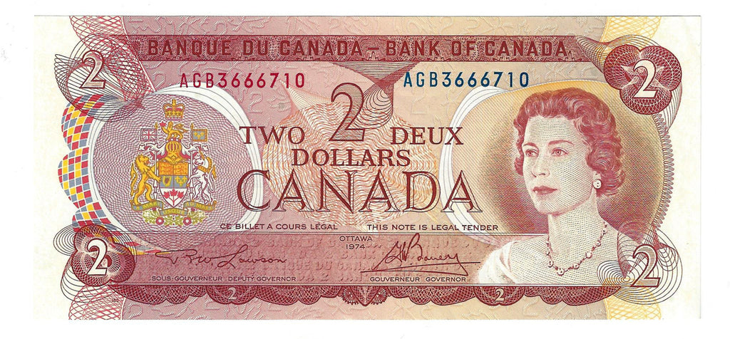1974 $2 Banknote Lawson-Bouey, Prefix AGB, BC-47a-i, Almost/Unc