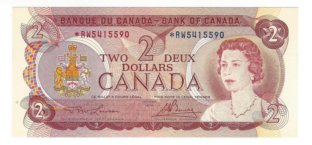 Replacement 1974 $2 Banknote Lawson-Bouey, Prefix *RW, BC-47aA, C/Unc