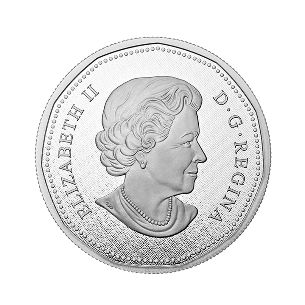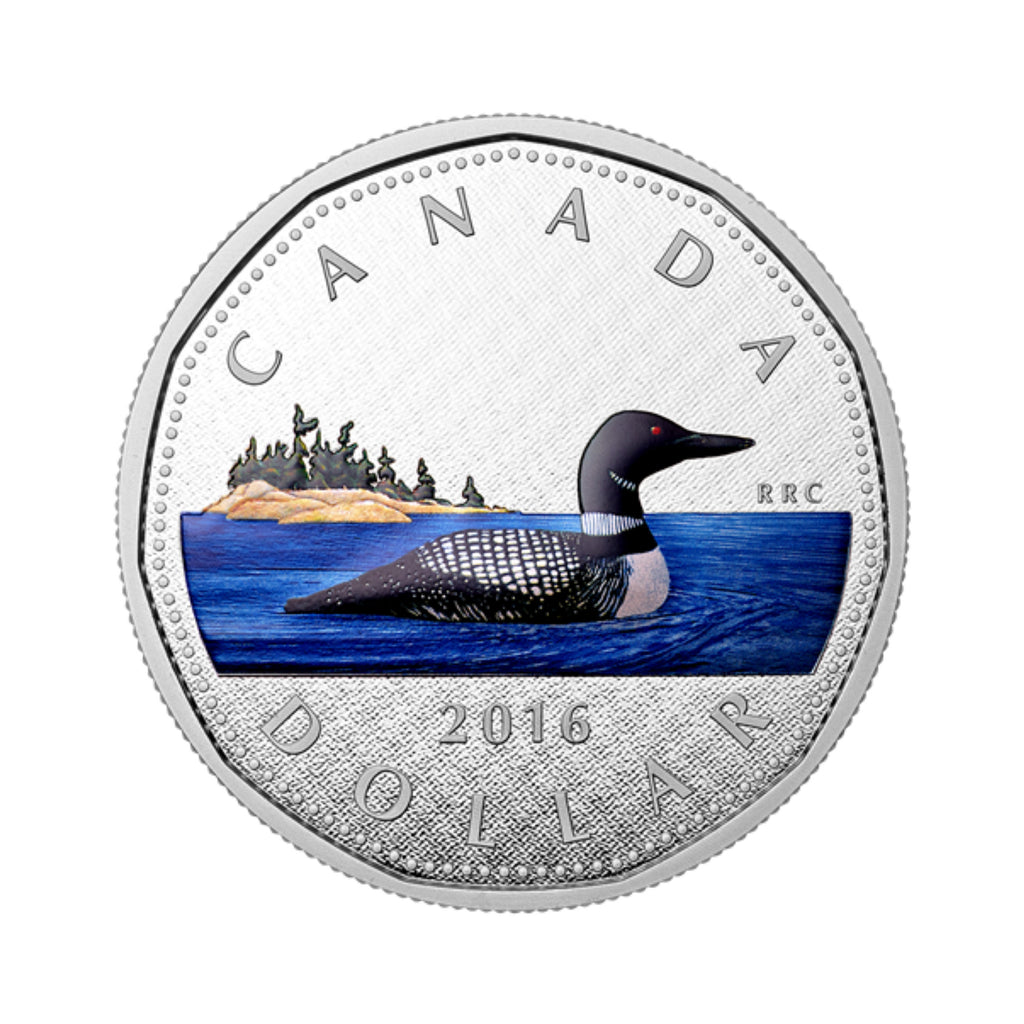 This 5-ounce fine silver 1-dollar coin features noted Canadian wildlife artist Robert-Ralph Carmichael's loon design, first issued with the introduction of the 1-dollar circulation coin in 1987. This design has been used continuously on Canadian “loonies,” with a number of notable exceptions.Part of the Royal Canadian Mint's exciting 6-coin series of 5-ounce pure silver versions of Canada's 5-cent, 10-cent, 25-cent, 50-cent, 1-dollar, and 2-dollar circulation coins.Selective colour on each coin's reverse makes this series particularly lovely and exceptionally unique.