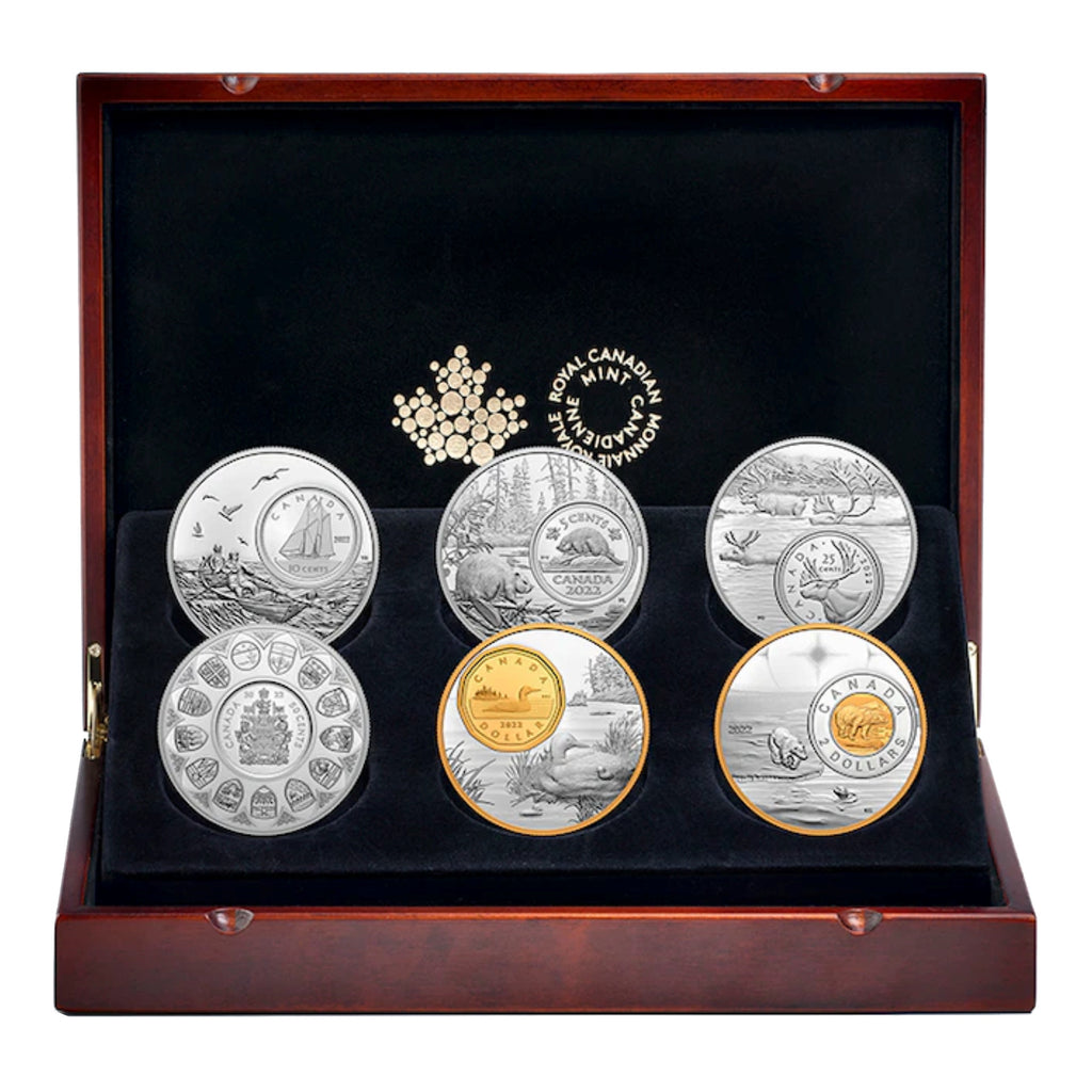Beaver 5¢,Bluenose 10¢,Caribou 25¢,Coat of Arms 50¢,$1Loon,$2 Polar bear