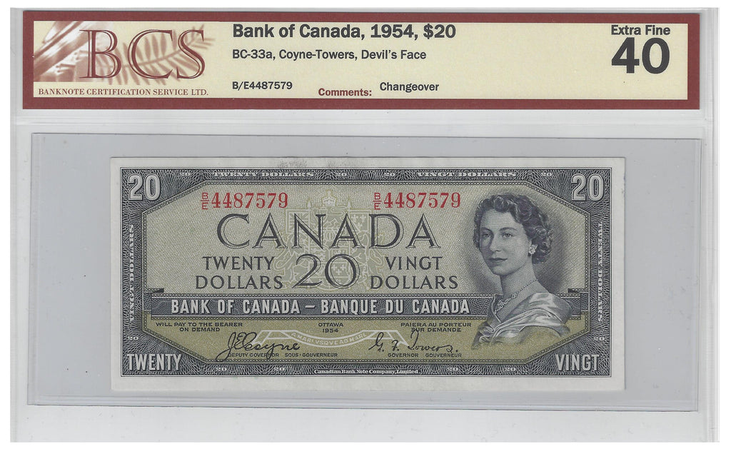 1954 Canada $20 Banknote Coyne-Towers,Devil's Face B/E, BC-33a BCS Certified (EF40)