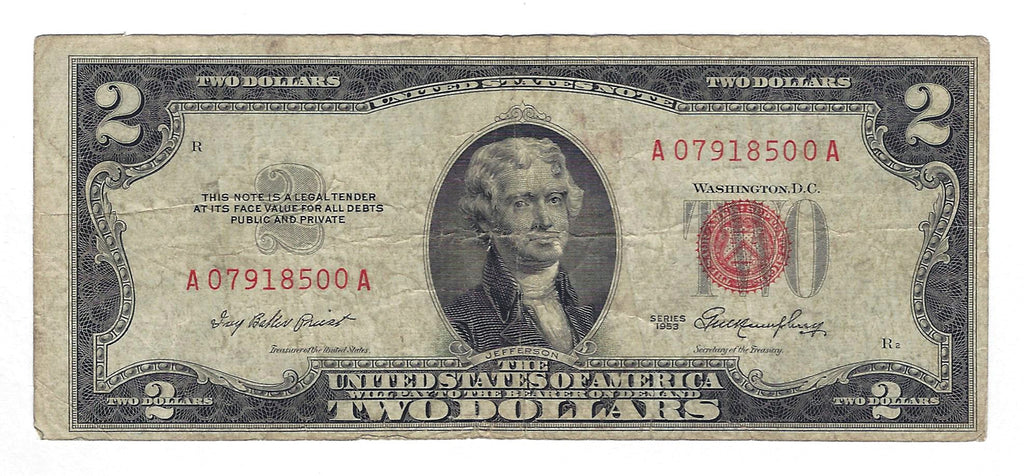 1953 USA $2 Two Dollar Bill Red Seal Number A07918500A (Fine)
