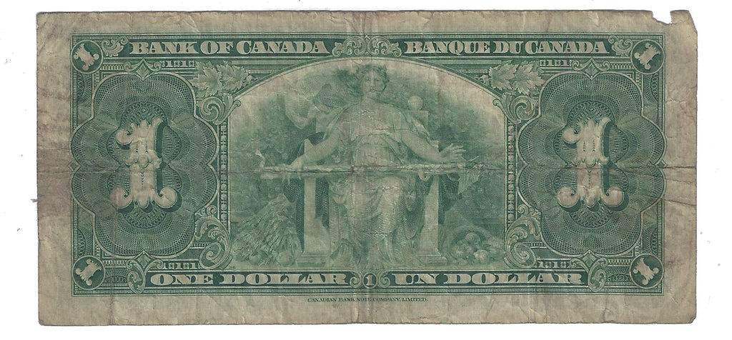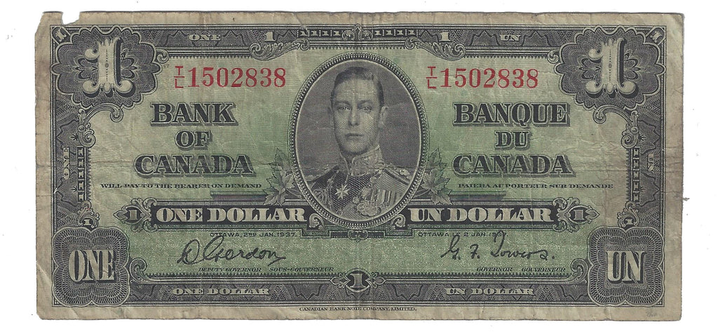 1937 Canada $1 Banknote Gordon-Towers (WP), T/L, BC-21c (VG)