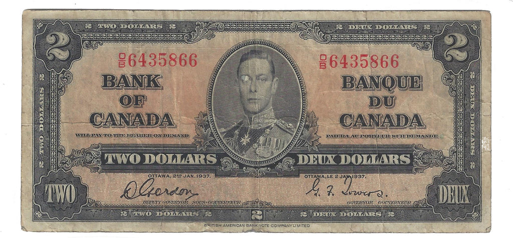 1937 Canada $2 Banknote Gordon-Towers,O/B, BC-22b (VG/F)